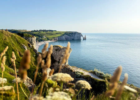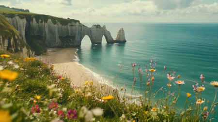 The picturesque cliffs of Étretat feature iconic white chalk arches rising from the turquoise sea, while vibrant wildflowers adorn the grassy shoreline, inviting tranquility.