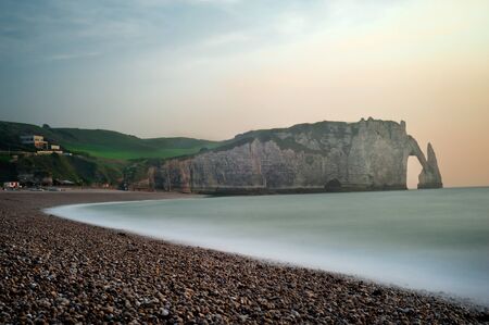 Scenic view of Etretat with its beach and famous cliffs with arches at sunset