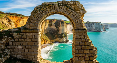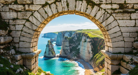 A natural archway in the white cliffs of ?tretat, France on a sunny summer day