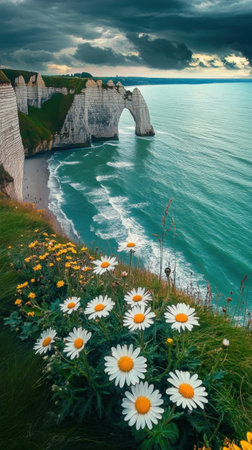 A beautiful seascape showcases vibrant daisies in the foreground with towering cliffs and the famous arch of Étretat in the background under an atmospheric sky.