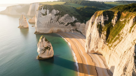 This image showcases towering white cliffs meeting the serene ocean. A sandy beach curves along the coastline under a bright sky. The composition features clear water and natural light, suitable for various editorial and commercial applications. The scene evokes a sense of vastness and natural beauty.