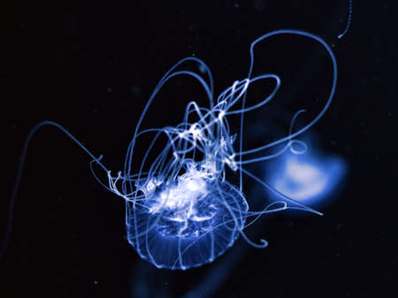 Group of Sanderia Malayensis, Amakusa Jellyfish swimming in aquarium pool with blue neon light. Theriology, biodiversity, undersea life, aquatic organism