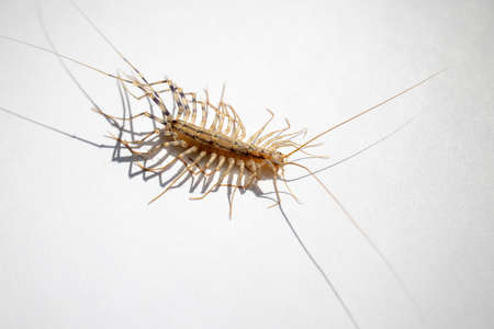 Arthropod insect centipede flycatcher on a concrete wall close up