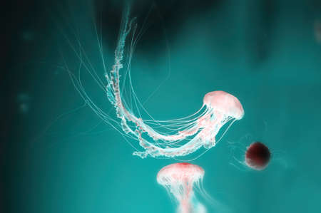 Close-up Jellyfish, Medusa in fish tank with neon light. Jellyfish is free-swimming marine coelenterate with a jellylike bell- or saucer-shaped body that is typically transparent.