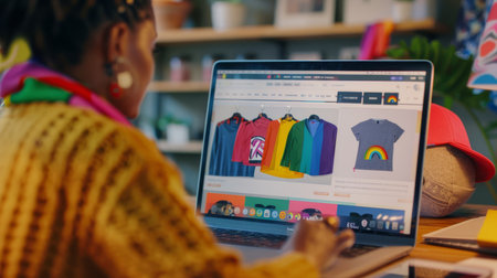 Entrepreneur browsing Pride-themed clothing online for a diverse fashion collection
