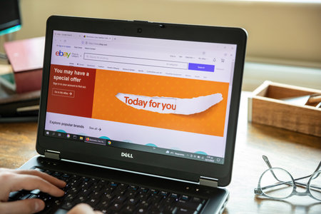 Greece, Athens, January 23 2022. EBAY app, online auction and sale. PC on table, screen with of official website for e commerce.