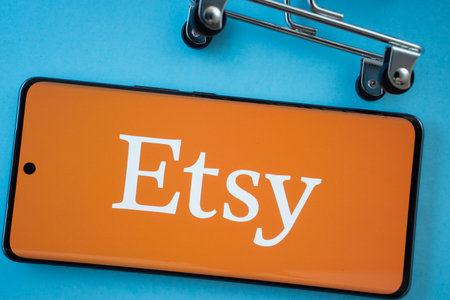 Kazan, Russia - Oct 6, 2021: Etsy is an American e-commerce company focused on handmade items and craft supplies. Smartphone with Etsy logo on screen in the shopping cart.