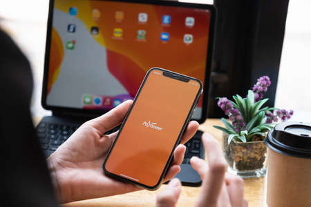 CHIANG MAI, THAILAND - Mar 08, 2021 Woman using Payoneer on iPhone with tablet on background. Payoneer is a worldwide online payment system