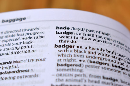 English Definition Dictionary Page Of Printed Word - Badge Close Up Image