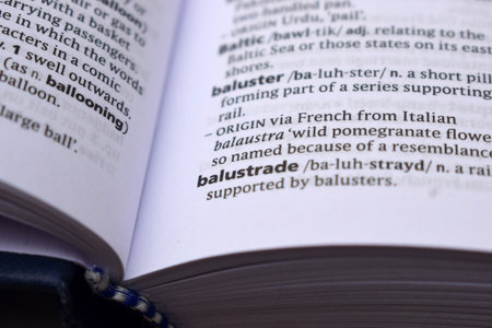 English Definition Dictionary Page Of Printed Word - Balustrade Close Up Image