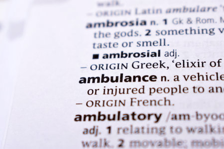 English Definition Dictionary Page Close Up Of Printed Word Of -ambulance