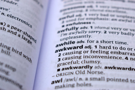 Close Up Of English Dictionary Page With Word - awkward