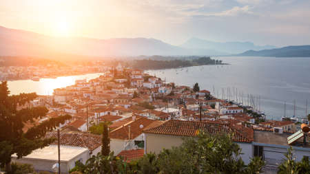 Piraeus city, Attica, beautiful panoramic view of Piraeus, Greece, with harbour and port, mountains and scenery beyond the city, seen from Prophet Helias Hill on Kastela Hill, sunset view