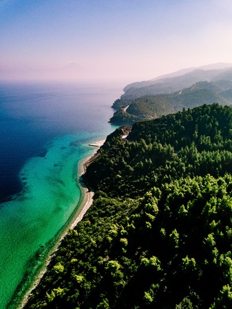 Hidden wild beach with sand against the green forest of the pine trees in Vourvourou, Sithonia, Greece. View from above