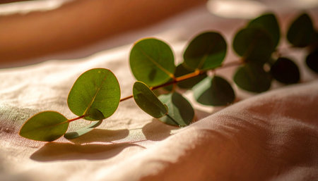 Realistic single eucalyptus branch with green leaves placed diagonally on soft wrinkled white linen fabric, natural morning light
