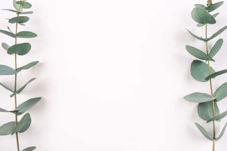 Green eucalyptus branches on a white background. Flat lay, top view.