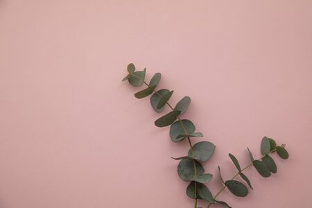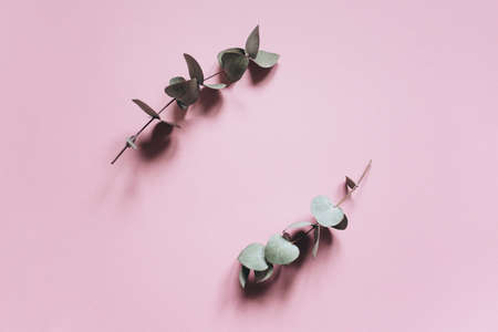 Eucalyptus branches on a pink background. Flat lay, top view. Copy space.