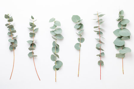 Eucalyptus branches on a white background. SPA concept. Flat lay, copy space for text