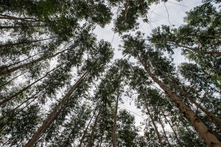 Point of view to the top of a forest of eucalyptus trees