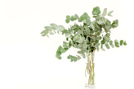 floristry minimalistic art. green eucalyptus twig on white background. nature and plants. copy space concept