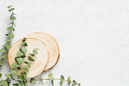 Top view of empty wooden cut with eucalyptus leaves on paper craft background. Mockup presentation for goods or cosmetics. close up.