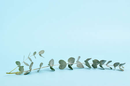 A banner with eucalyptus branches on a light blue background is minimalism. background for eco-cosmetics. A place to copy.
