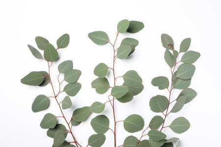Eucalyptus branches on white background. Flat lay, top view.
