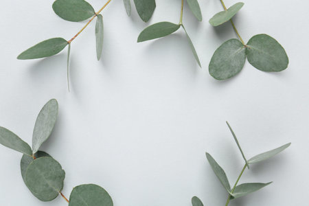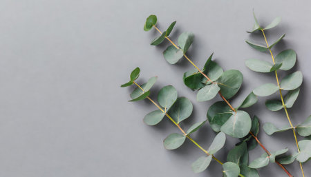 Top view photograph of eucalyptus branches on a soft pastel gray background, offering clean minimalistic aesthetics, perfect for mockup designs, natural concepts, and creative content with ample