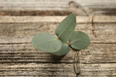 Beautiful eucalyptus branch on wooden background, closeup