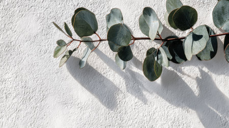Eucalyptus branch shadows cast on matte white wall, elegant daylight overlay, simple and organic natural texture for branding or interior design
