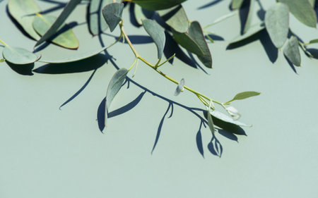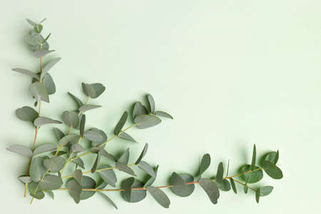Fresh eucalyptus leaves on green background with copy space. Decoration and medical herb.