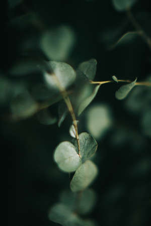 Branch of eucalyptus on dark green background, gloomy photo of the plant