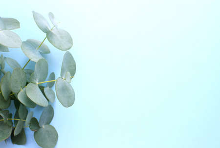 Eucalyptus branches on soft blue background Flat lay, top view. floral background.