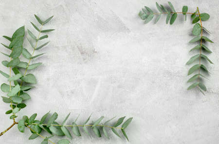 Eucalyptus twigs on a concrete background in the form of a frame. Blank space for text or product advertisement