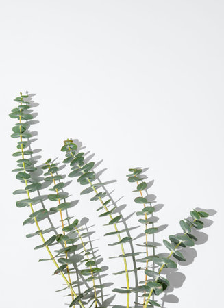 Flat lay of eucalyptus branches on white background with sunlight and shadow. Natural and eco-friendly design concept for postcard or advertisement layout. Top view and copy space.