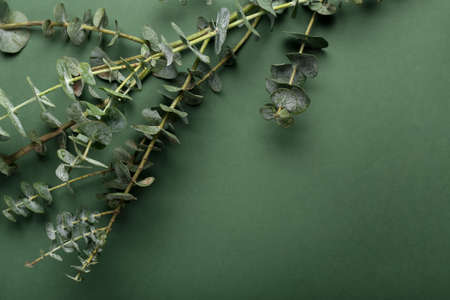 Eucalyptus branch with fresh leaves on color background, top view. Space for text