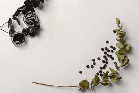 Composition with bowls of activated carbon mask, pills and eucalyptus branches on white background