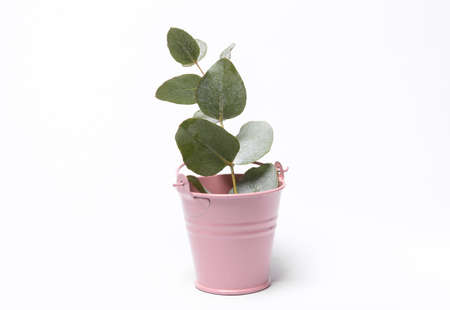 Bucket with sprig of eucalyptus isolated on white background