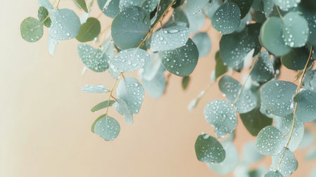Delicate eucalyptus leaves falling softly, tiny water droplets clinging to their edges, warm natural hues, generative ai
