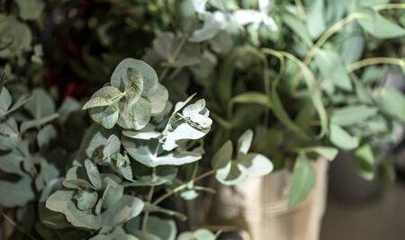 Eucalyptus plant leaves. Fresh Eucalyptus close up, on green background. Essential oil, aromatherapy. Medical plant.