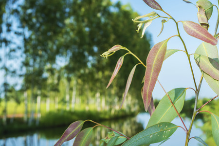 Blur effect of the eucalyptus many high into the sky in elevation clear dimly bright and sunny