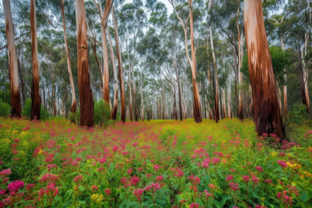 eucalyptus grove, with flowers blooming in vibrant colors, created with generative ai