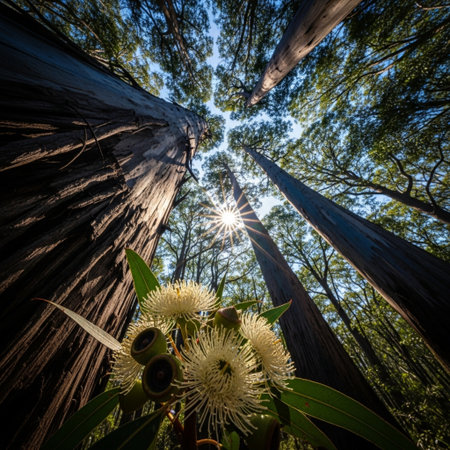 eucalyptus grove, with towering trees and blooming flowers, created with generative ai