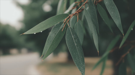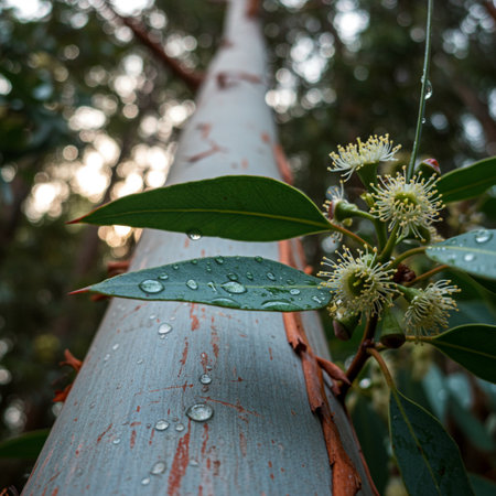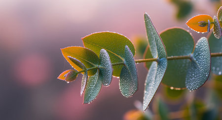Eucalyptus leaves covered in glistening dew drops, illuminated by soft morning light. capturing freshness and natural beauty, highlighting botanical detail.