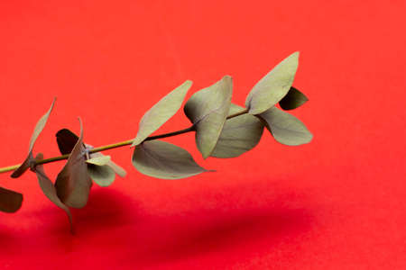 a green branch of eucalyptus on a red background. Eucalyptus branch for creating bouquets