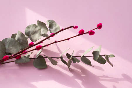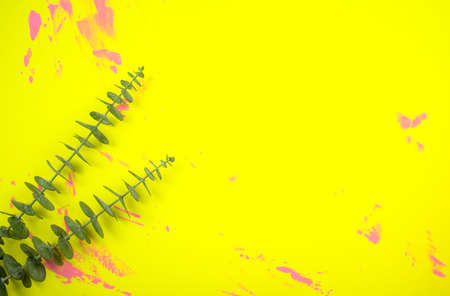 Eucalyptus leaves composition flat lay on vivid colorful yellow with pink acrylic color background. Ingredients for medicine, natural beauty cosmetics, spa, flower flat lay concept, etc.