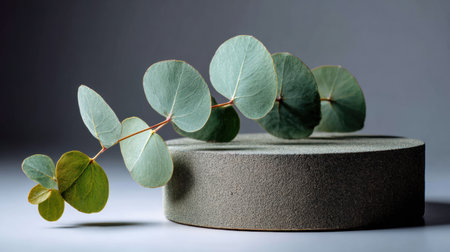 Fresh eucalyptus leaves rest on a minimal stone podium, set against a muted green backdrop, suggesting a tranquil skincare theme.