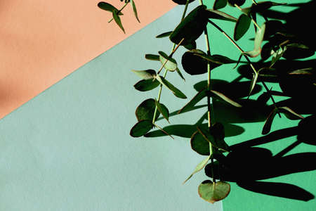 Eucalyptus branch on colorful background. Abstract backdrop for blogs, cards, web design. Nature concept