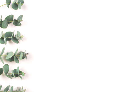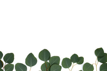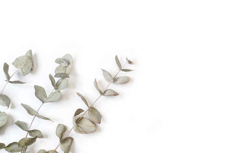 eucalyptus branch with green leaves on a white background, eucalyptus leaves flat laying, top view, copy space
