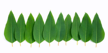 A collection of lush green leaves gracefully scattered across a pristine white backdrop.